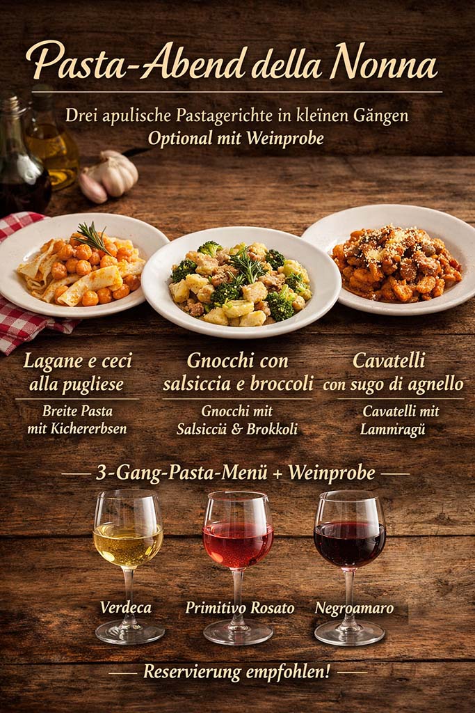 Drei apulische Pastagerichte im Nonna-Stil, optional mit Weinprobe und ganz viel atmosfera.