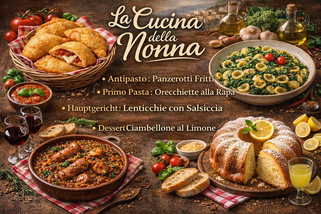 Zweite Ausgabe der Reihe Cucina della Nonna mit 4 Gängen apulischer Hausmannskost und Hauswein in der Karaffe.