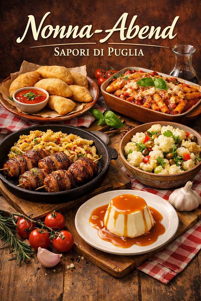 Vierte Ausgabe der Reihe Cucina della Nonna mit 4 Gängen apulischer Hausmannskost und Hauswein in der Karaffe.